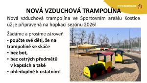 Nová vzduchová trampolína ve Sportovním areálu Kostice je připravena na hopkací sezónu 2026! Žádáme rodiče, aby poučili své děti o pravidlech bezpečného skákání a ohleduplnosti k ostatním, aby si všichni mohli užít tuto zábavu bez rizika úrazu.