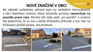 V obci bylo na základě žádosti občanů doplněno nové dopravní značení, které má na vedlejších komunikacích upozornit účastníky silničního provozu na pravidlo pravé ruky.