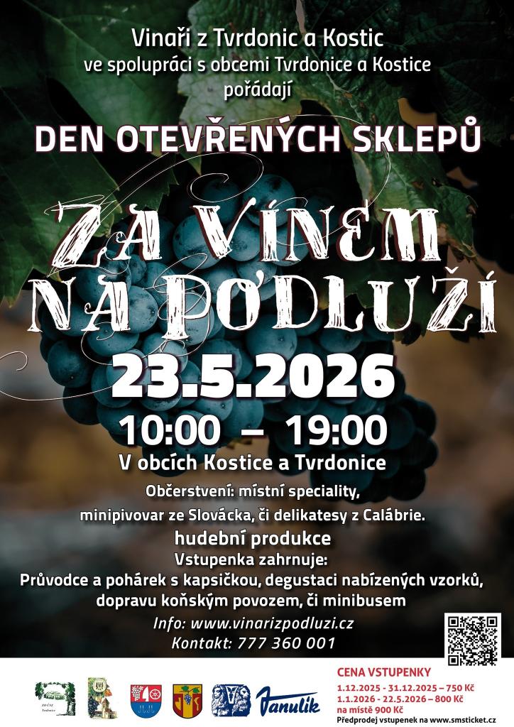 Vinaři z Kostic a Tvrdonic vás zvou na Den otevřených sklepů "Za vínem na Podluží", který se koná od 10:00 do 19:00. Čekají vás místní speciality, minipivovar ze Slovácka či delikatesy z Calábrie, ale hlavně lahodné víno a cimbálová muzika.