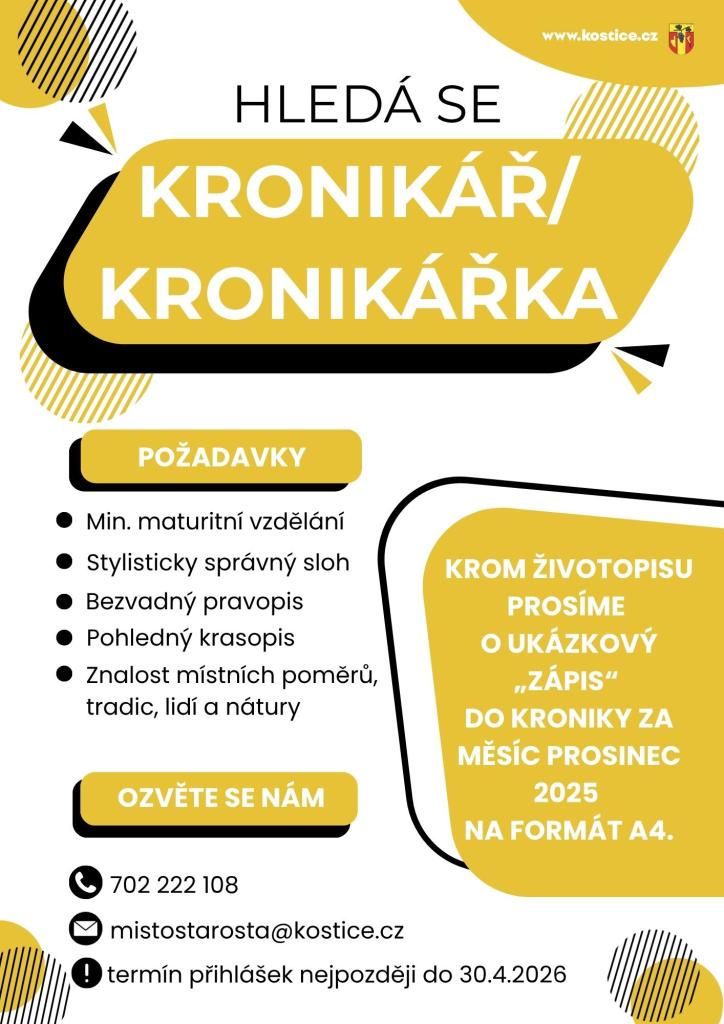 Obec Kostice hledá nového kronikáře!