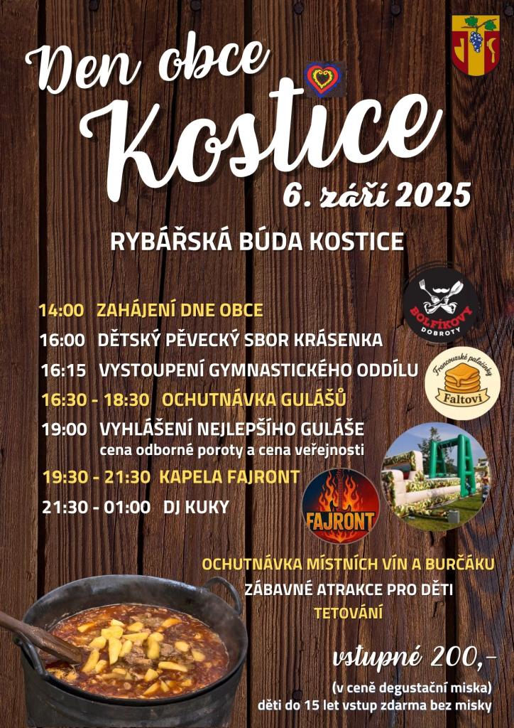 Den obce Kostice se koná 6. září 2025. O program se postarají jak děti z Krásenky a gymnastického kroužku, tak samotní soutěžící O nejlepší kostický guláš! Nezapomeňte také na hudební vystoupení kapely Fajront a DJ KUKY! Děti do 15 let mají vstup zdarma!