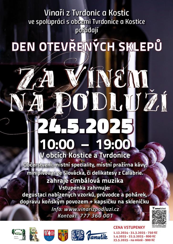 Vinaři z Kostic a Tvrdonic  pořádají Den otevřených sklepů. Akce se uskuteční od 10:00 do 19:00 a můžete ochutnat místní speciality a vína. Vstupné zahrnuje vzorky, pohárek a dopravu koňským povozem. Cena vstupenky se liší podle data zakoupení.