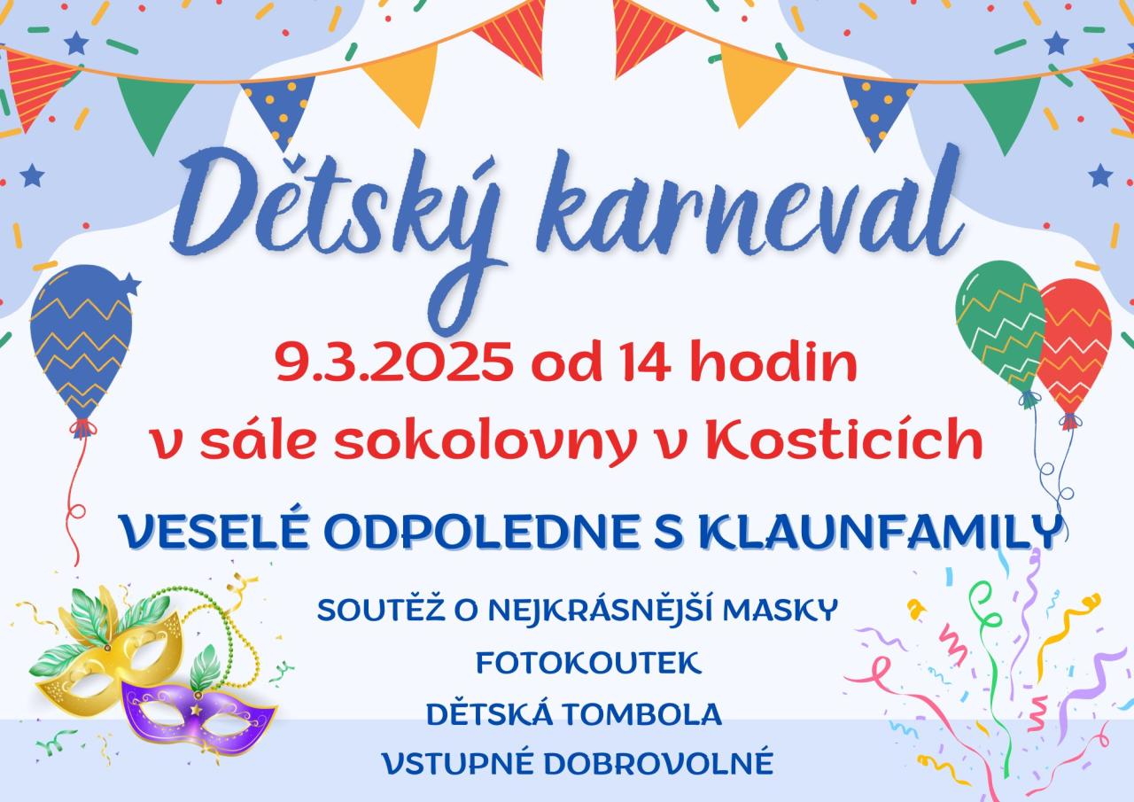 Dětský karneval se uskuteční 9. března 2025 od 14 hodin v sále sokolovny v Kosticích. Akce nabídne veselé odpoledne s klauny, soutěž o nejkrásnější masky, fotokoutek a dětskou tombolu. Vstupné je dobrovolné, takže si přijďte užít odpoledne plné zábavy a smíchu.