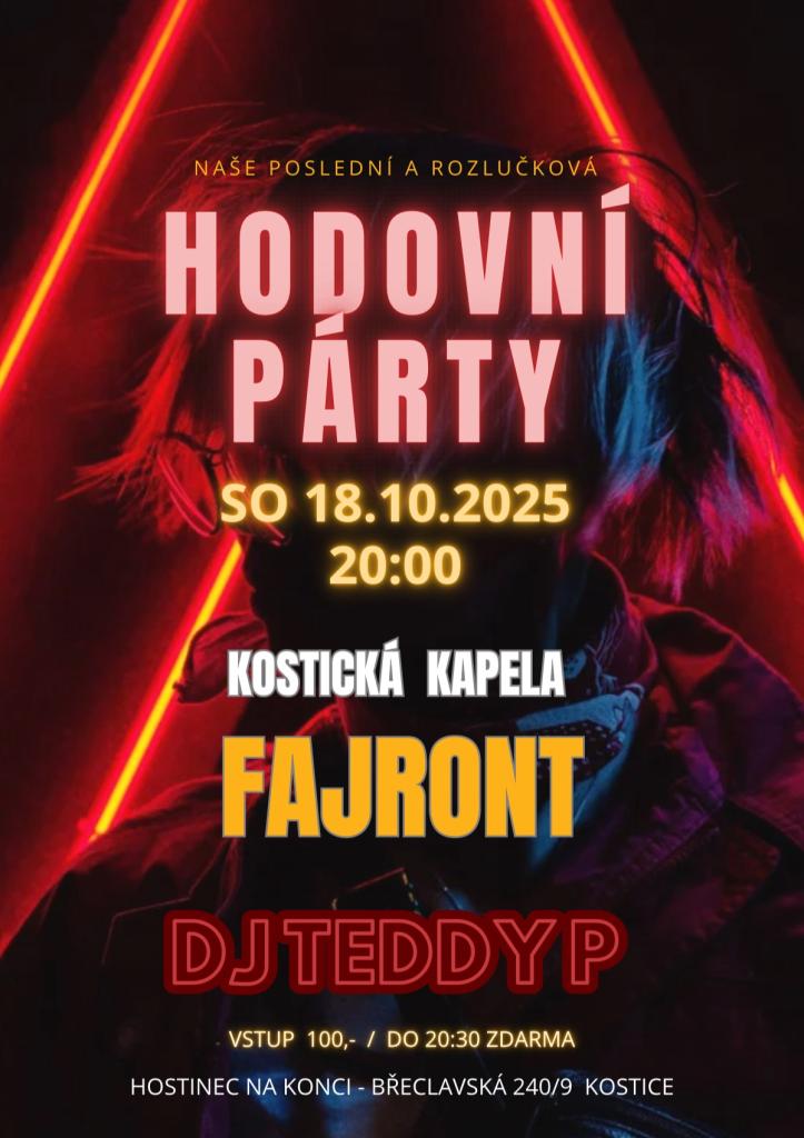 Přijďte si užít legendární hodovní párty a večer plný hudby s kapelou Fajront a DJ TEDDY. Vstupné do 20:30 je zdarma, poté je vstup 100 Kč. Těšíme se na vás!