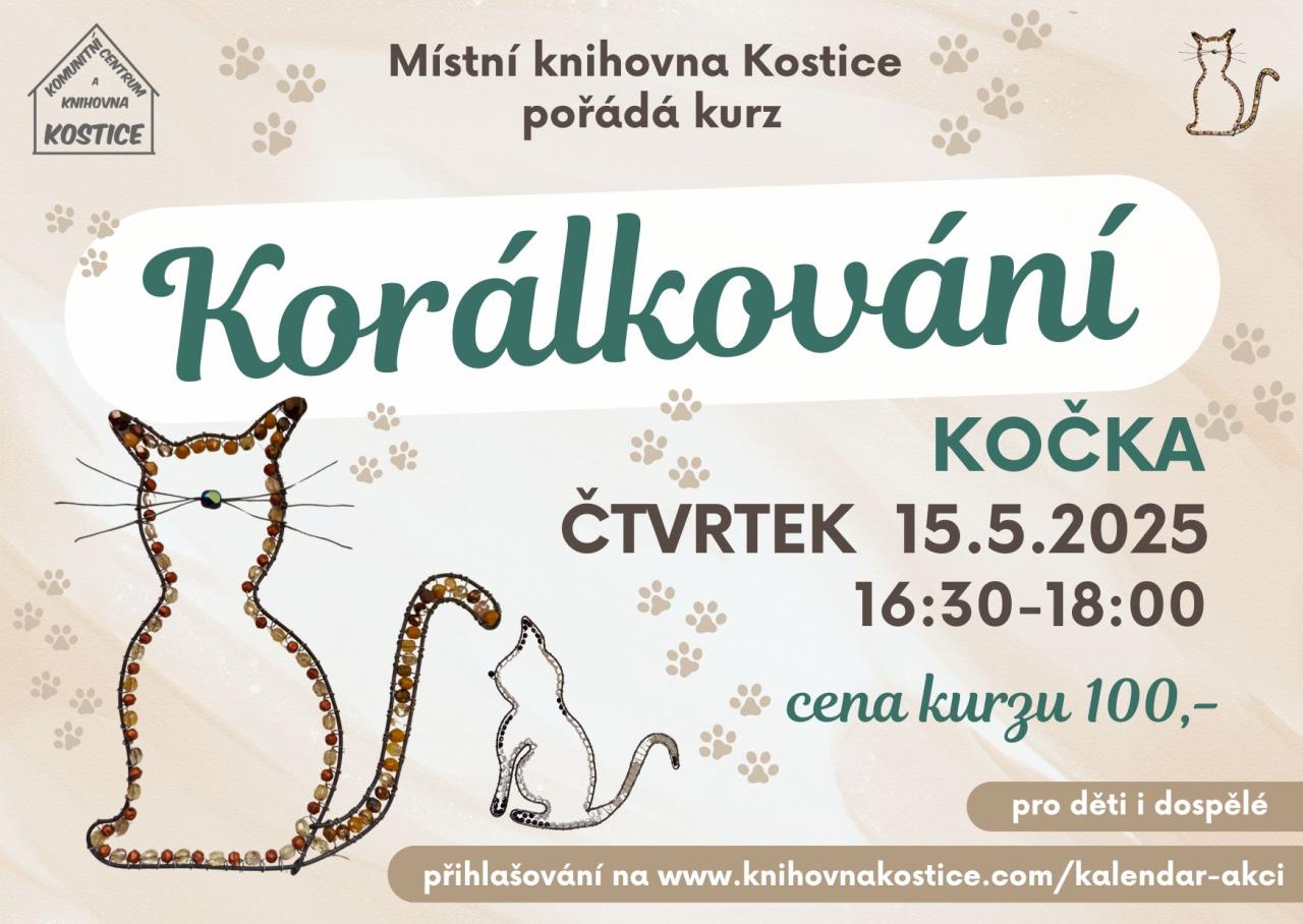 Přijďte na kurz korálkování, který se koná ve čtvrtek 15. května 2025 od 16:30 do 18:00. Cena kurzu je 100 korun. Přihlásit se můžete na www.knihovnakostice.com/kalendar-akci.