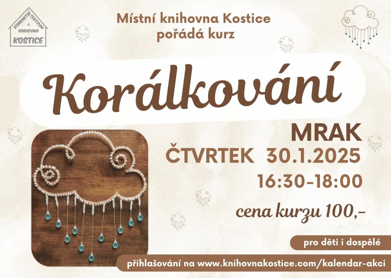 Korálkování pro kreativní duše Přijďte na kurz korálkování, který se koná ve čtvrtek 30. ledna 2025 od 16:30 do 18:00. Cena kurzu je 100 korun. Přihlásit se můžete na www.knihovnakostice.com/kalendar-akci.