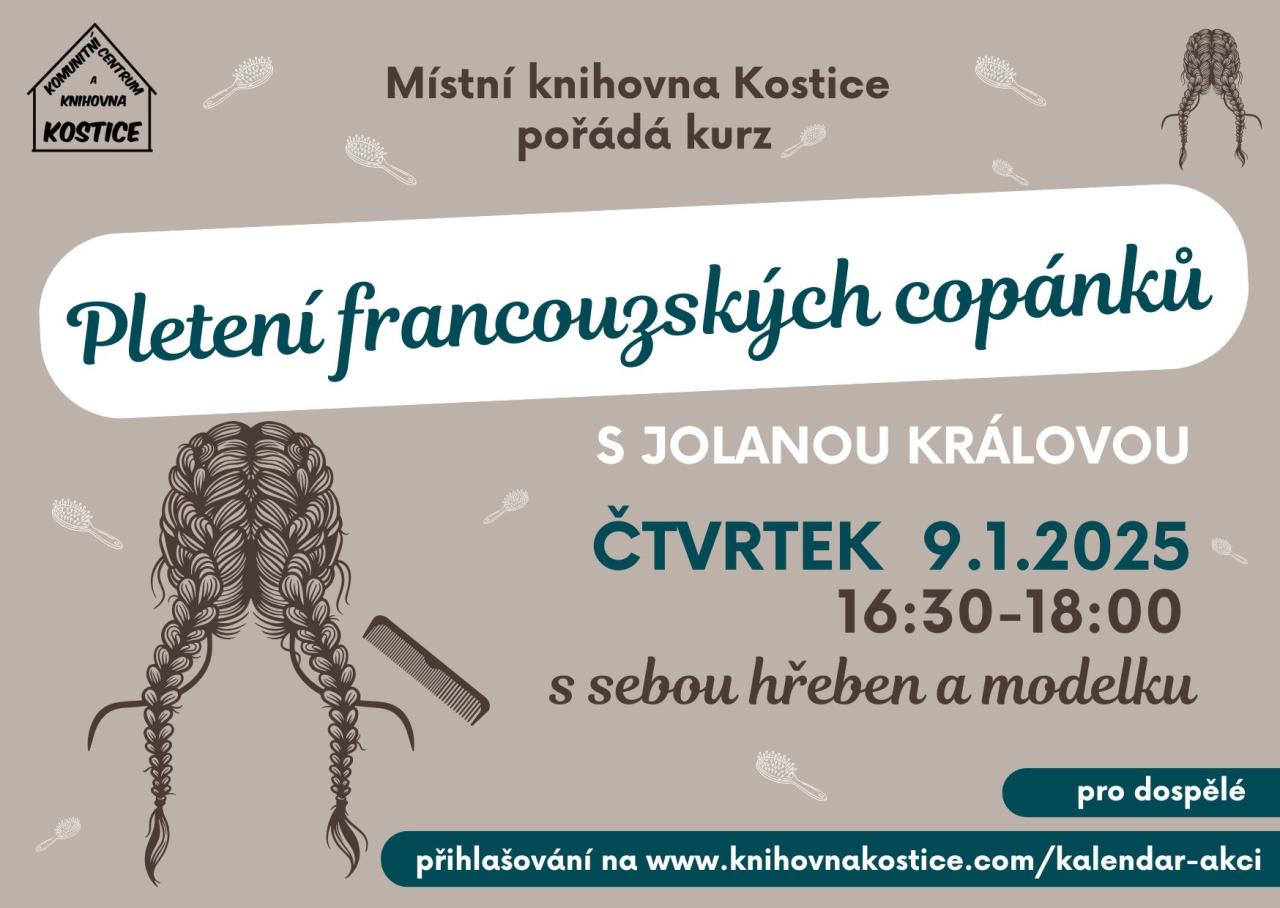 Pletení francouzských copánků Místní knihovna Kostice pořádá kurz, ve kterém se naučíte zaplétat francouzské copánky pod vedením Jolany Králové. Modelku a hřeben si přineste s sebou. Přihlaste se na www.knihovnakostice.com/kalendar-akci.