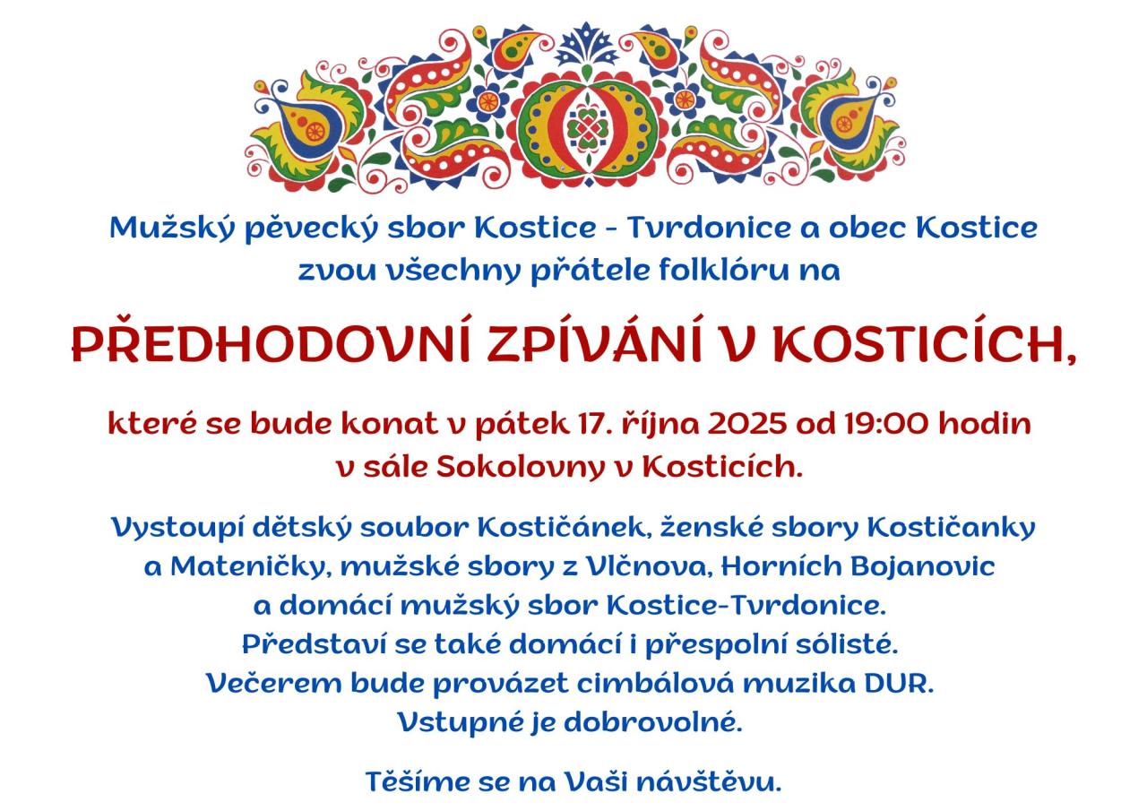 V pátek 17.10.2025 se v sále sokolovny uskuteční Předhodové zpívání za účasti dětí z Kostičánku, skvělých sborů i sólistů. Těšíme se na vaši účast.
