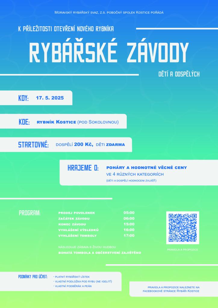 Moravský rybářský svaz pořádá rybářské závody dětí a dospělých při příležitosti otevření nového rybníka. Akce proběhne 17. 5.2025 na Kostickém rybníku. Startovné činí 200 Kč pro dospělé, pro děti je zdarma. Čeká na vás bohatý program, tombola a občerstvení.