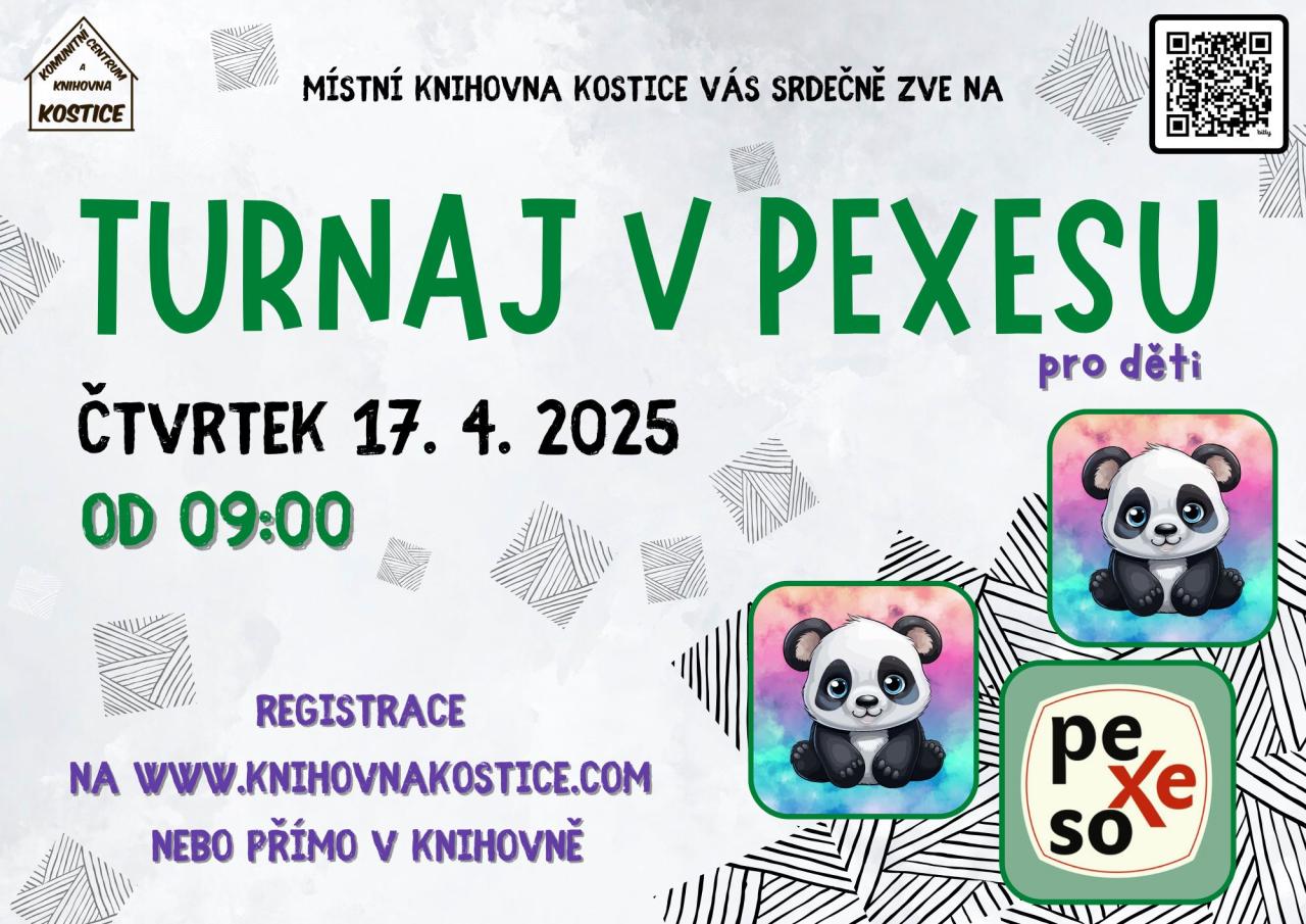 Zveme vás na turnaj v pexesu, který se uskuteční v kostické knihovně 17.4.2025 od 9:00 h. Přijďte si poměřit síly a užít si zábavné dopoledne plné her. Přihlásit se můžete na nwww.knihovnakostice.com/kalendar-akci nebo přímo v knihovně.