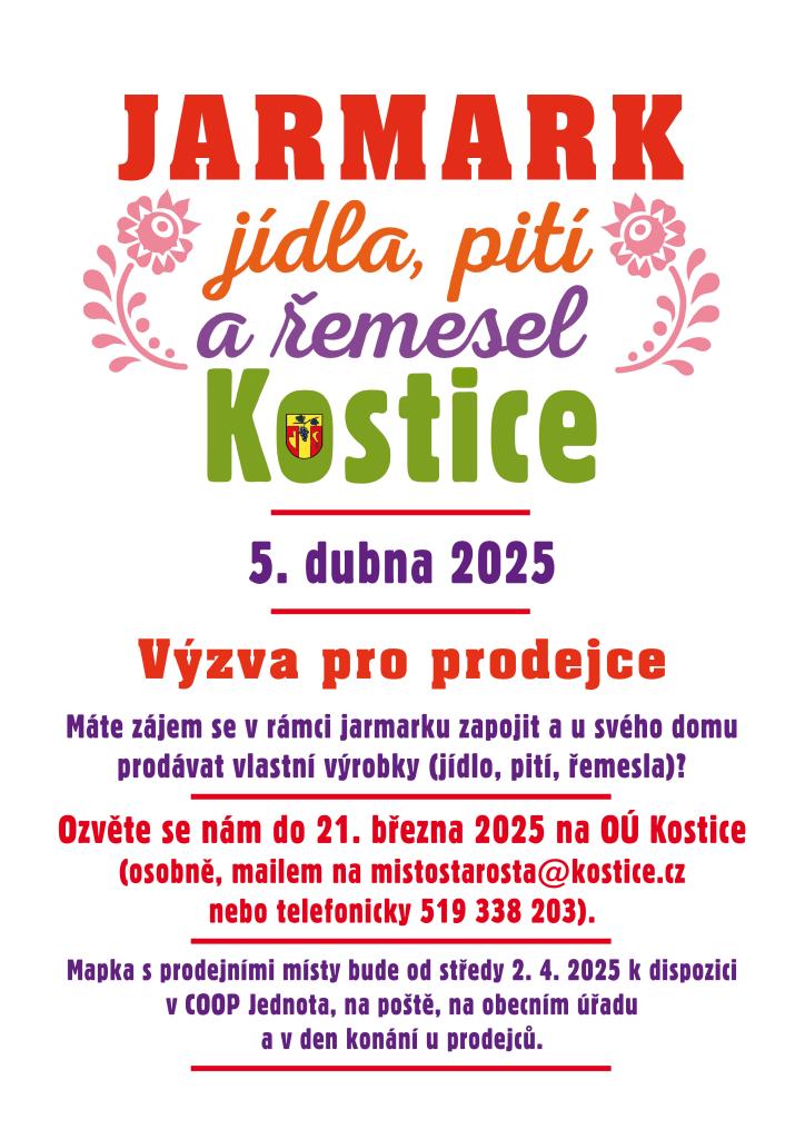 V rámci jarmarku, který se koná 5. dubna 2025, mají prodejci možnost prodávat vlastní výrobky, jako je jídlo, pití a řemeslné výrobky. Zájemci se mohou přihlásit do 21. března 2025 na OÚ Kostice. Mapka s prodejními místy bude k dispozici od 2. dubna 2025.